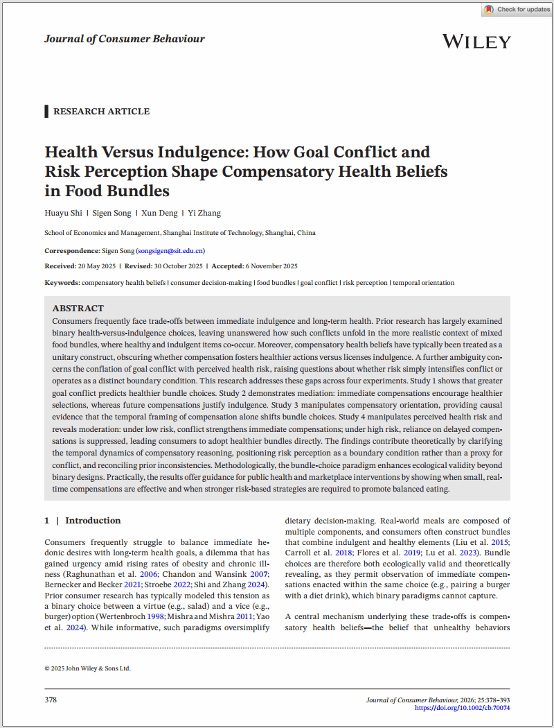 文献引用:Shi H, Song S*, Deng X, Zhang Y. Health Versus Indulgence: How Goal Conflict and Risk Perception Shape Compensatory Health Beliefs in Food Bundles[J]. Journal of Consumer Behaviour, 2026, 25(1): 378-393.DOI: 10.1002/cb.70074.