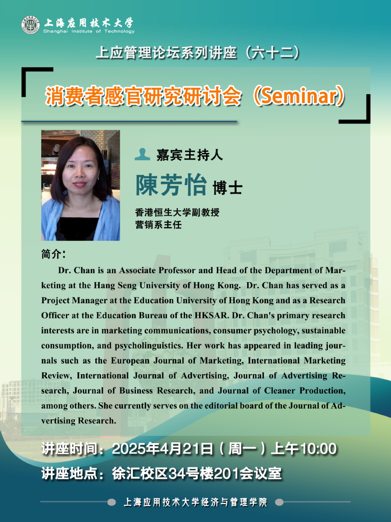 2025年4月21日上午,香港恒生大学商学院营销系主任、上应大消费者行为研究中心兼职研究员陈芳怡博士来经济与管理学院交流。学术交流前,学院院长熊焰教授热情接待了陈博士,双方代表学院互赠纪念品。
