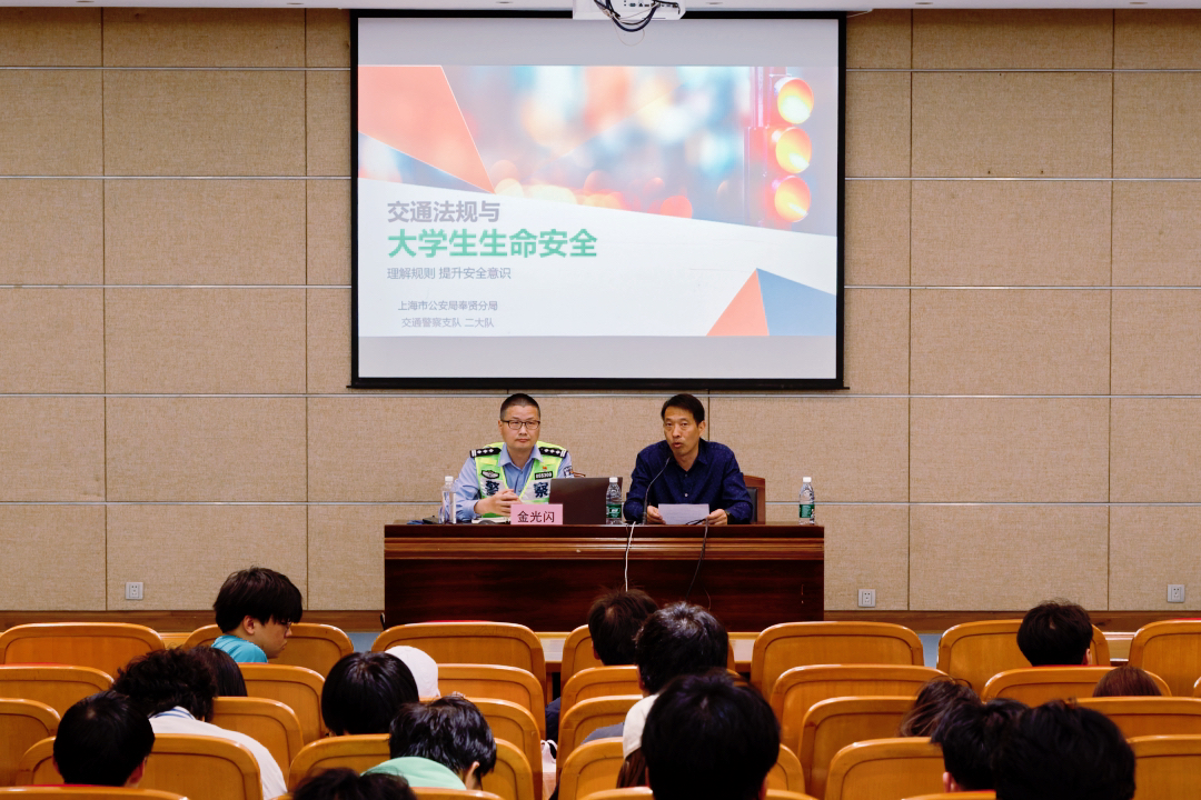 为增强大学生的交通安全意识,4月21日,安全保卫处组织各二级学院(部)平安志愿者开展校园交通安全知识专题培训讲座。本次讲座邀请奉贤公安分局交警支队一级警长金光闪警官现场授课,以“交通法规与大学生生命安全”为题,为同学们讲解校园交通安全知识。