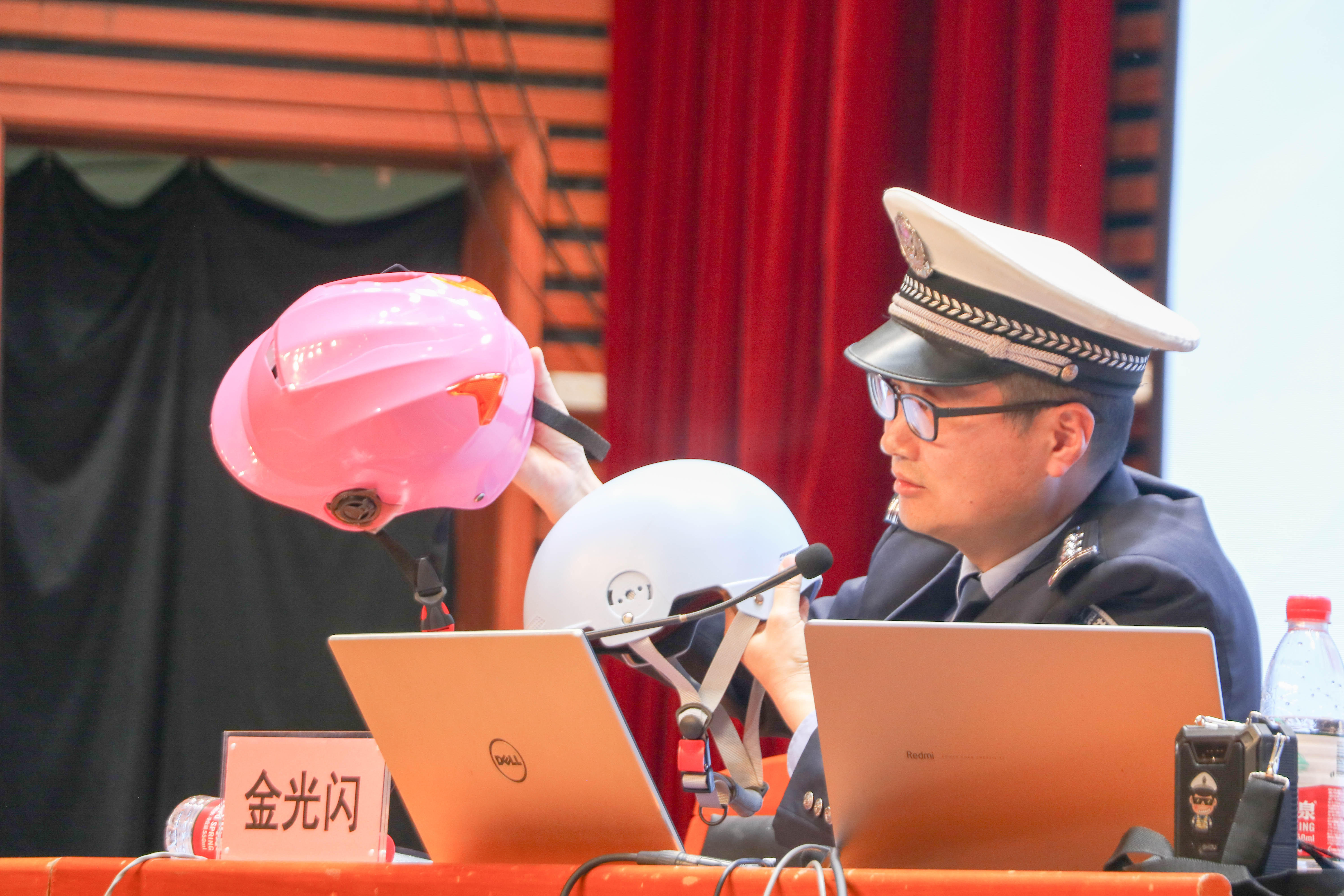 金警官以“当代大学生道路交通安全知识”为题,结合近年来一些大学生交通事故真实案例,深入剖析造成交通事故的原因,观看了因酒驾、超速、不戴头盔、闯红灯等交通违法行为导致的交通事故警示片,增强学生们对交通安全的认识和理解。金警官还现场互动邀请学生体验航空材料头盔和普通塑料头盔的安全性。校平安志愿者还为同学们发放交通安全知识宣传单。