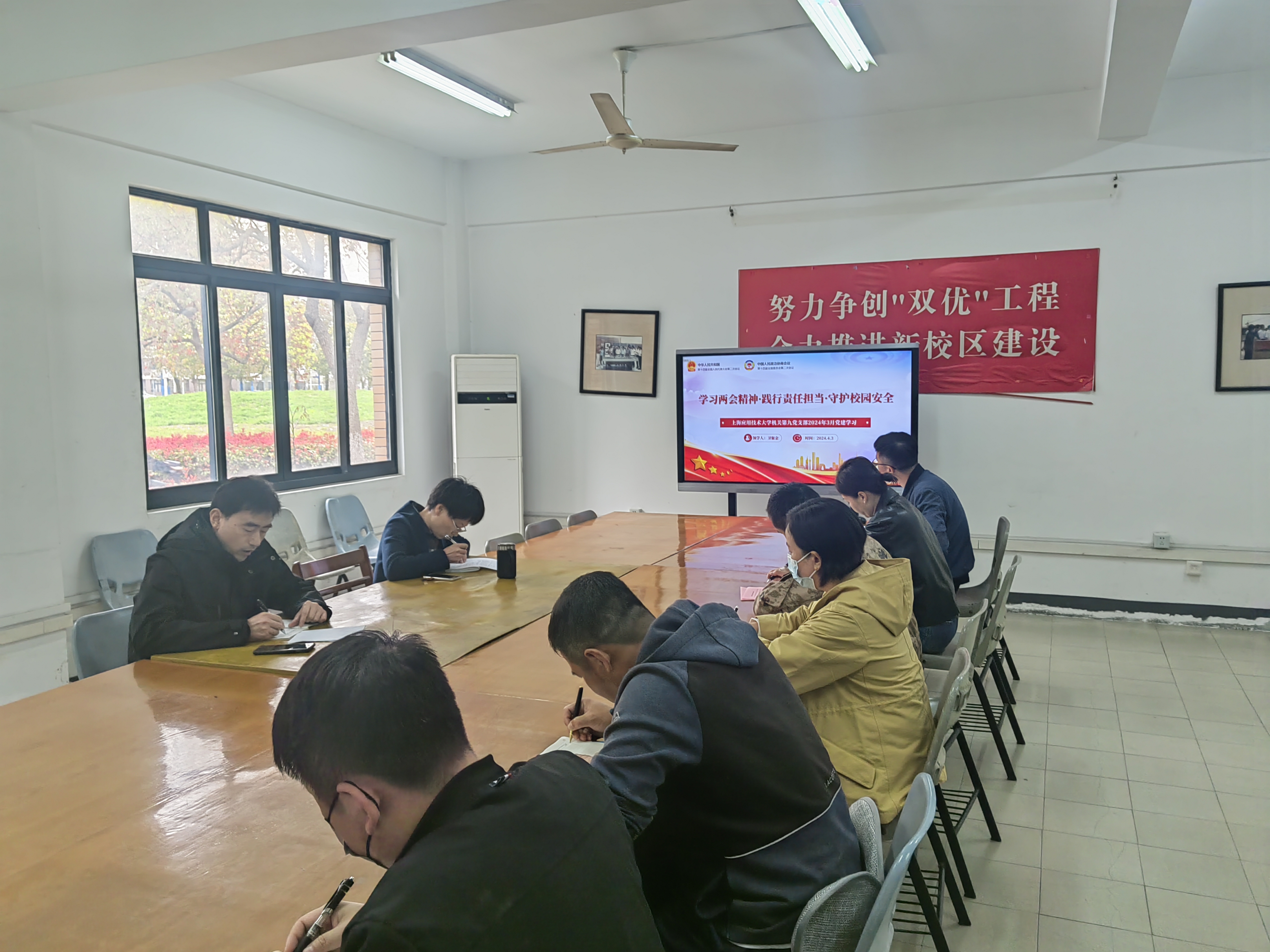 卫聚金以《学习两会精神·践行责任担当·守护校园安全》为题,领学了习近平总书记在2024年全国两会期间发表的系列重要讲话以及政府工作报告,梳理了“新三样”、“新质生产力”等15个两会热词新词;传达了校党委书记郭庆松、校长汪小帆在2024年春季干部大会上以及《2024年度党政工作要点》对校园安全稳定工作的指示精神。