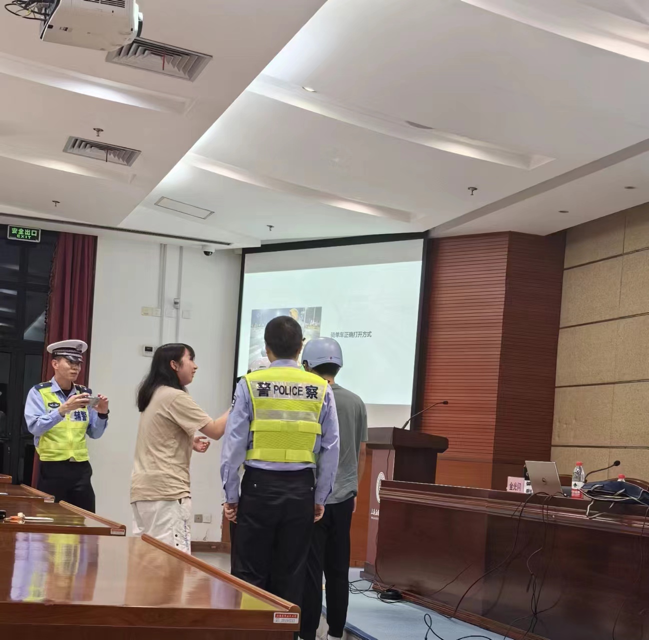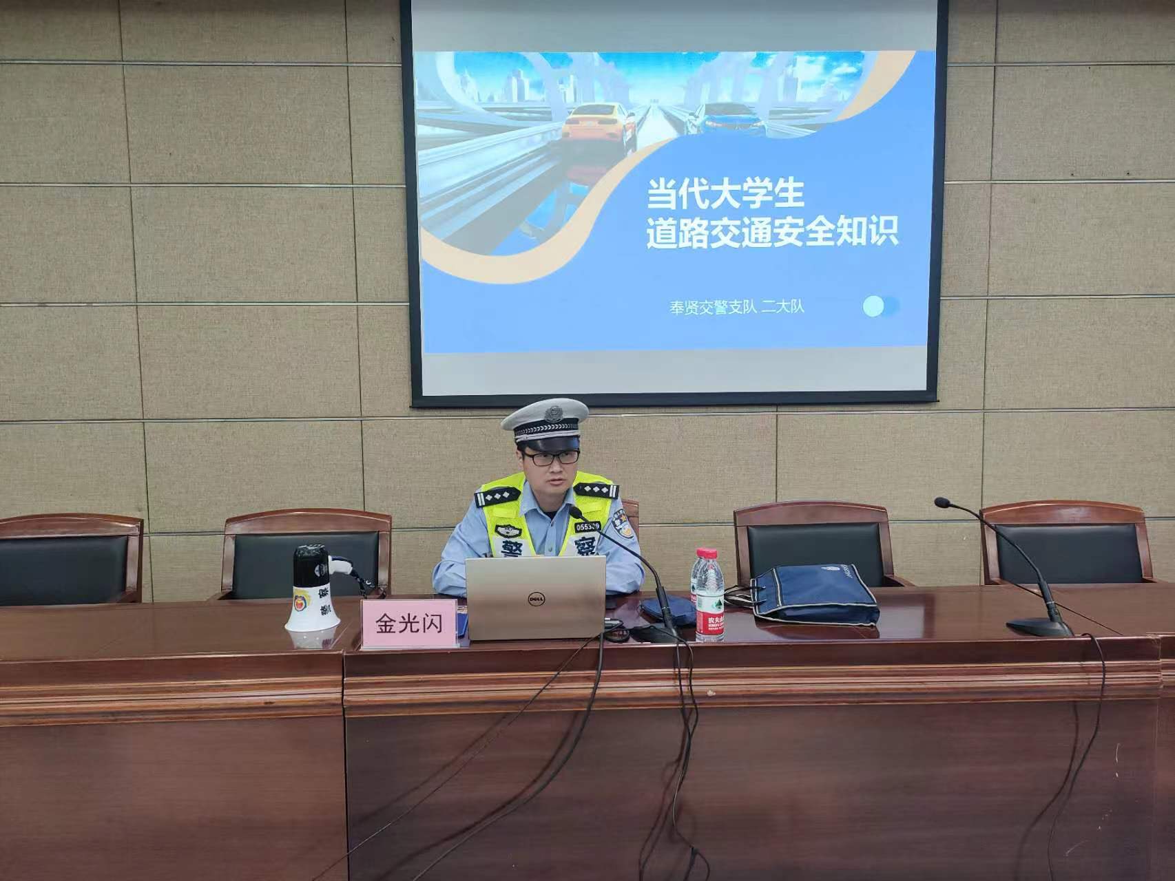 本次讲座邀请了奉贤区交警支队专职交通安全宣传民警、一级警长金光闪警官,从事交通安全宣传工作15年,每年开展宣传讲课一百余场次,具有丰富的安全宣传经验,为同学们讲解校园交通安全。